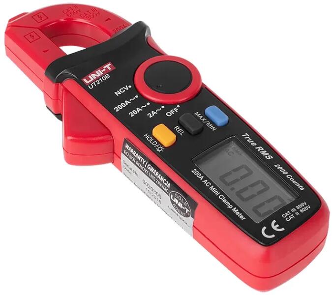 Univerzális lakatfogó mérőműszer, 200A AC, UNI-T UT210B Az UT210B zsebméretű lakatmérő TRUE RMS funkcióval lehetővé teszi a gyors és kényelmes AC terhelésmérést 2A/20A/200A -ig. A készülék könnyű és nagyon könnyen használható, Olyan villanyszerelők számára hasznos, akik naponta gyakori és gyors elektromos vizsgálatokat végeznek. A mérési hibák elkerülése érdekében a készülék alacsony akkumulátortöltöttség-jelzővel rendelkezik. Ezenkívül az akkumulátor élettartamának maximalizálása érdekében a mérőműszer automatikus kikapcsolási opcióval van felszerelve. Technikai leírás: MÉRÉSI TARTOMÁNYOK:  Váltóáram: 2 A/ 20 A/ 200 A ±(2,5%+20) KIEGÉSZÍTŐ FUNKCIÓK: